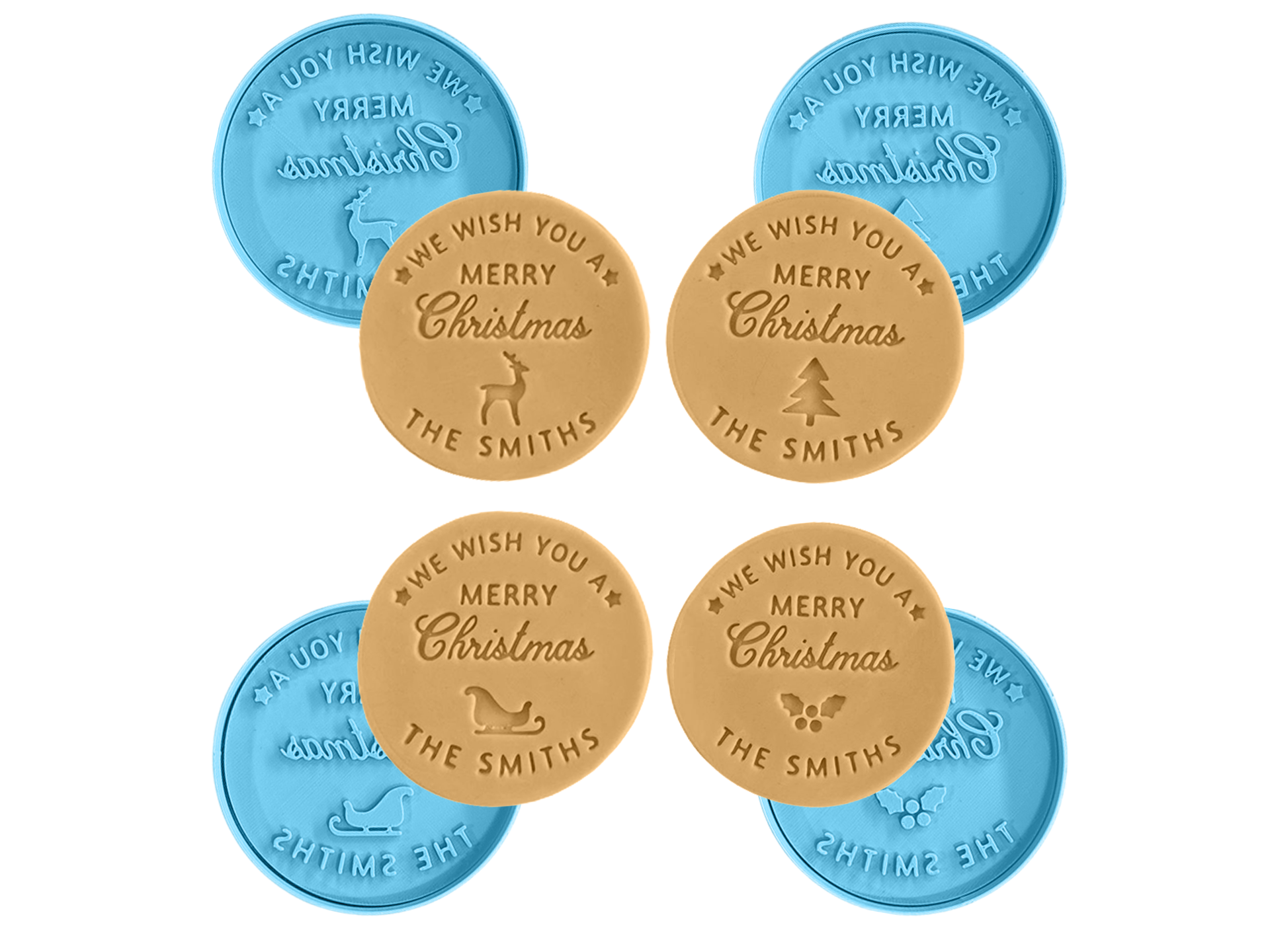 You’ll receive 4 custom stamps + 4 matching cutters + 4 stamp holders, perfectly sized for holiday cookies.
